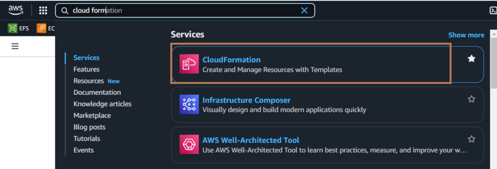 1.First Go To AWS Management Console and Search Cloud Formation.
