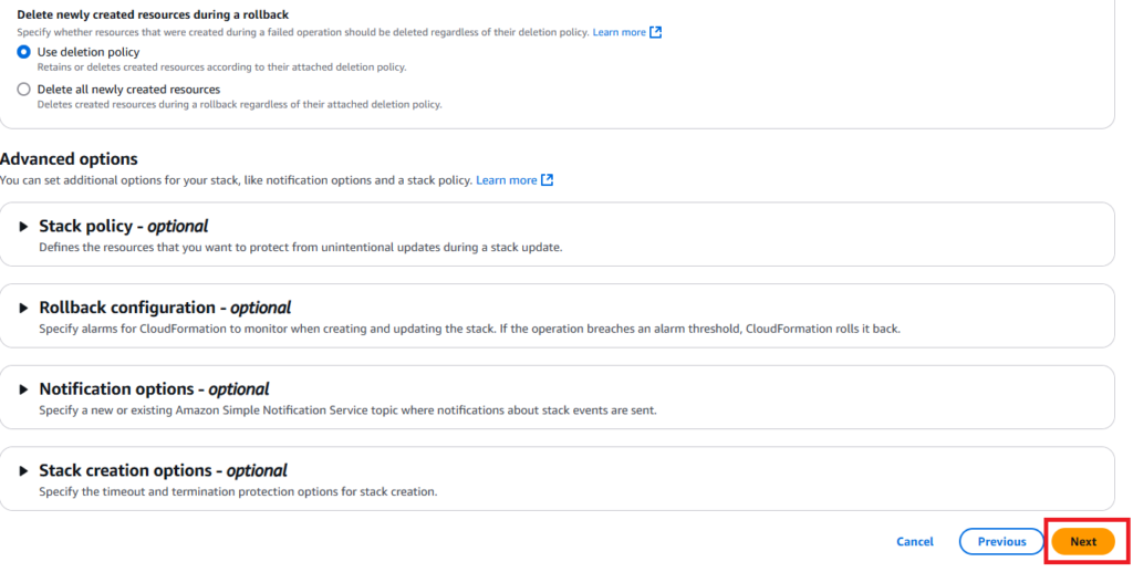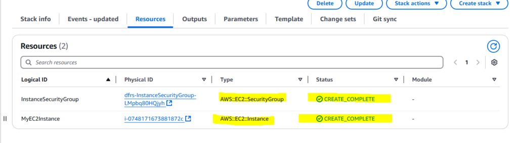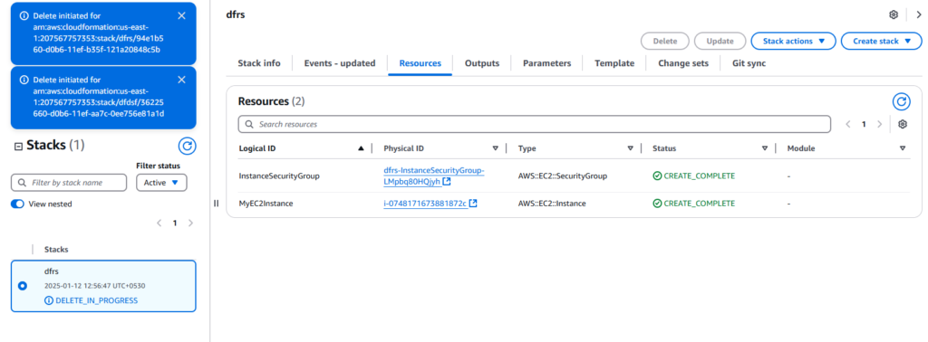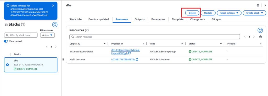 Note:You delete the stack all infrastructure has removed you created by cloud formation stack.