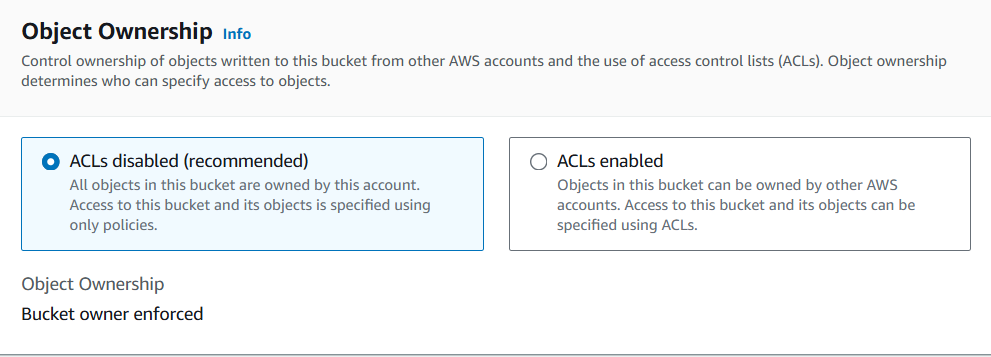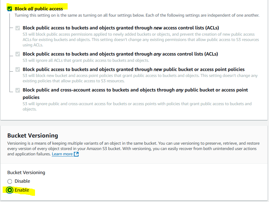 By default Block all public access is ticked do not uncheck unless you need a bucket to be public.