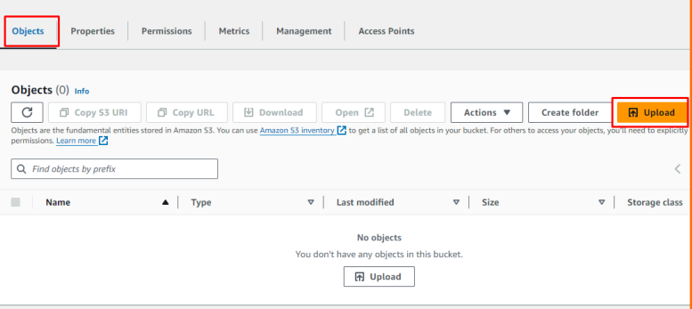 Step 4: On the Objects tab for your bucket, choose Upload.