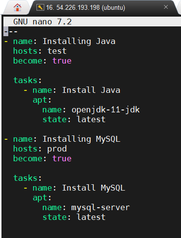 this file is used for installing Java in Salve 1 which is test as the group name and MySQL and Slave 2 which is prod as the group name.