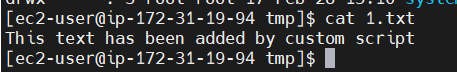 echo "This text has been added by custom script" >> /tmp/1.txt