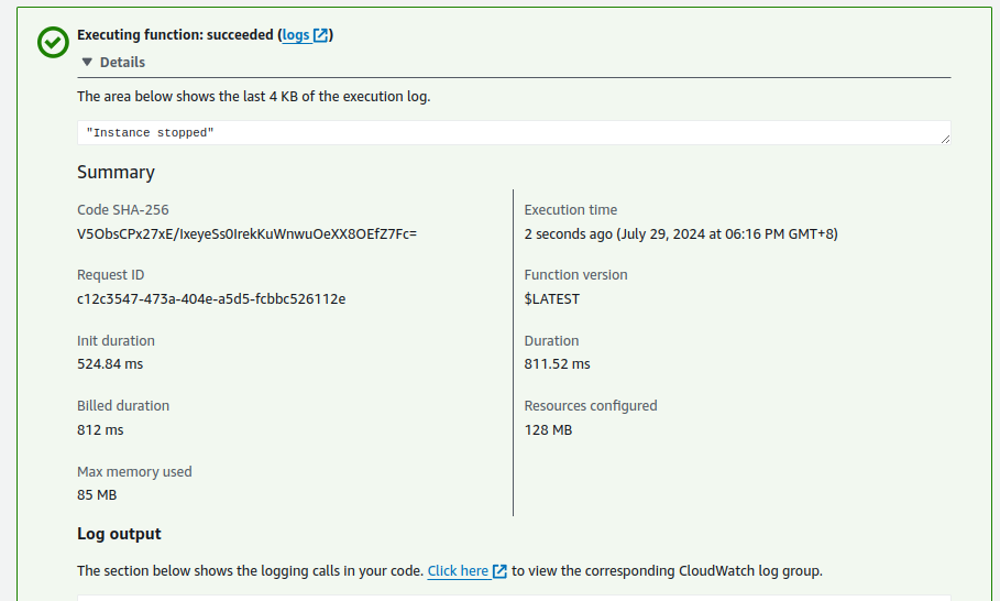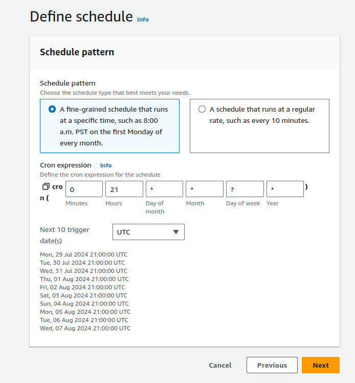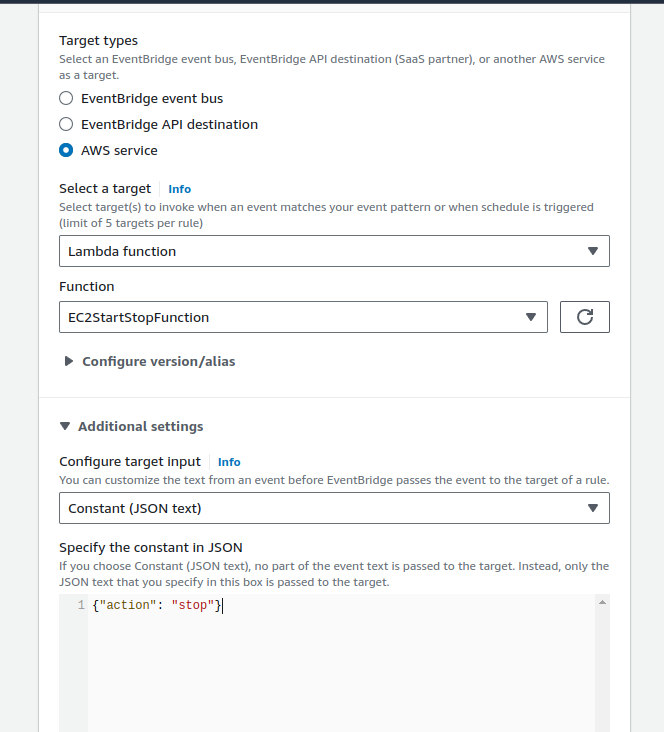 • Schedule: Set the cron expression to stop the instance (e.g., 0 6 * * ? * to stop at 6 AM UTC every day).