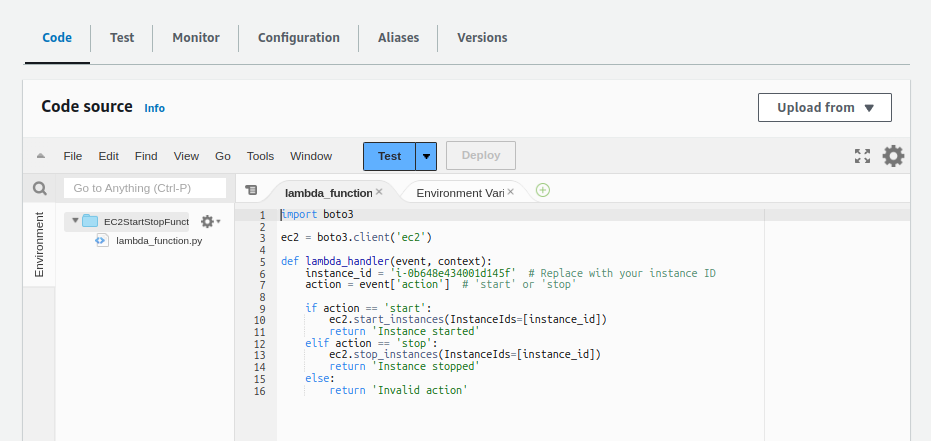 Add the following code to the Lambda function (Python example) Code Editor Tab: