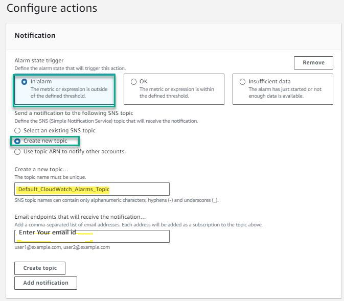 I do not have an SNS topic already created so I am creating a new SNS topic, if you have already a topic just select the existing SNS topic