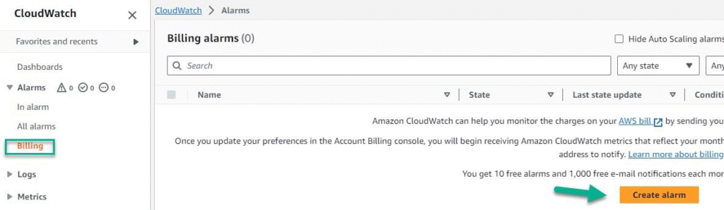 CloudWatch → Alarms → Billing → Create Alarm