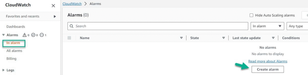 CloudWatch → In Alarm → Create Alarm